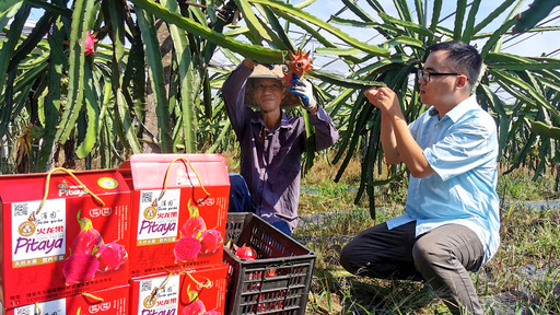 针对“919电商节”,浙江省瑞安市邮政分公司马屿营业部员工提前走访火龙果种植户,将火龙果引入邮政电商平台,帮助农户销售。邮政员工还协助农户进行火龙果采摘、装箱、称重、装车工作,为火龙果线上销售、线下寄递打通“绿色通道”。截至9月15日,瑞安市分公司已“销售+寄递”火龙果3000件。图为邮政员工在果园协助农户采摘火龙果。 □狄瑶  摄影报道