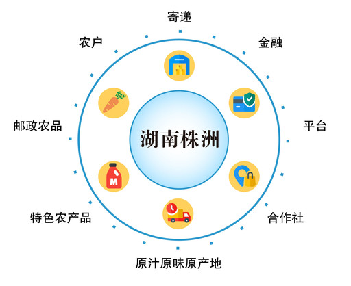 围绕特色农产品,坚持“原汁原味原产地”的价值主张,构建“基地+合作社+农户+平台+金融+寄递”的服务模式,拓展前方市场、建设后方基地、夯实中间保障,打造“邮政农品”品牌。这一生态模式在湖南株洲得到了最佳实践。