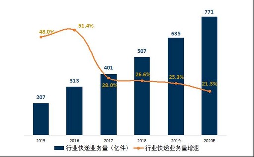 图1 2015年至2020年全国快递服务企业业务量