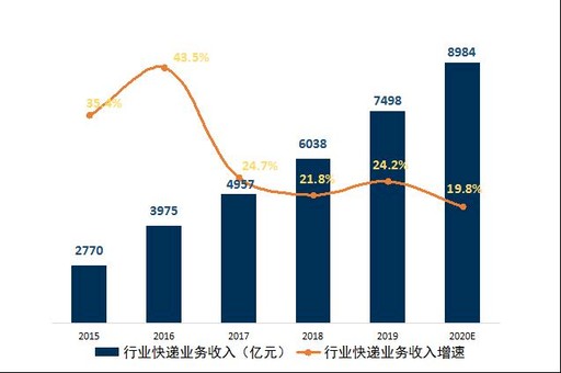 快递行业继续保持较高增速。2019年,全国快递服务企业业务量累计完成635亿件,同比增长25.3%,业务收入累计完成7498亿元,同比增长24.2%。经测算,预计2020年快递行业业务量约为771亿件,增速为21.3%;业务收入约为8984亿元,增速为19.8%。(见图1、图2)