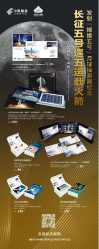 文昌航天主题邮局同步发行了《长征五号遥五运载火箭发射“嫦娥五号”月球探测器纪念》邮资封片组合、邮折、邮册等系列邮品。