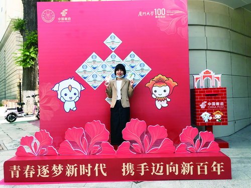为献礼厦大百年华诞,中国邮政集团特别为厦门大学校园主题邮局开通了厦门大学百年校庆专题个人定制邮票服务,校友和师生扫描中国邮政“微邮筒”二维码进入邮票DIY界面,就可让自己的照片登上邮票,将个人与厦门大学百年华诞珍贵瞬间一起定格,永远珍藏。该服务支持线上、线下定制,在主题邮局网点内可立等可取。目前有“我在厦大等你”和“凤凰花开 青春绽放”两种版式可选。