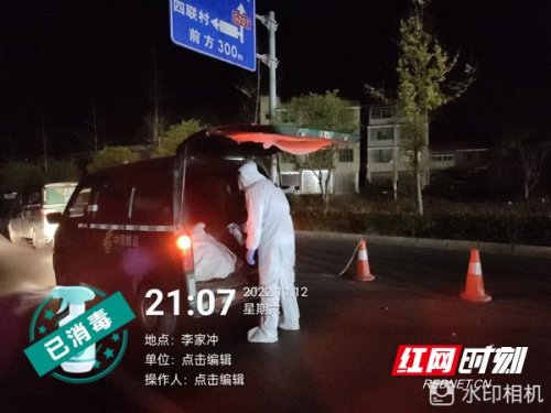 21点10分,邮车到达邵阳县交接防疫卡口,邵阳县邮政分公司陈伟、刘泽湘两位同志穿上密封的防护服早已等候多时,他们将邮袋做了全面消杀处理,交接完成后驾驶邮车向目的地驶去。21点50分,邮件到达邵阳县李家冲,两人与其家人完成面交。