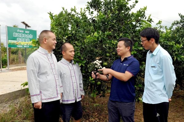 在蔻橙种植基地,邮政邀请中化测土配方专家走到橙园里,为合作社社员提供农资农技服务。专家钻进果园,现场教学。在合作社邮政示范园,专家周喜武将PH值测试仪插入土壤,数值显示为6.8,“现在土壤PH值为6.8,属于酸性土壤,利于蔻橙的生长”。