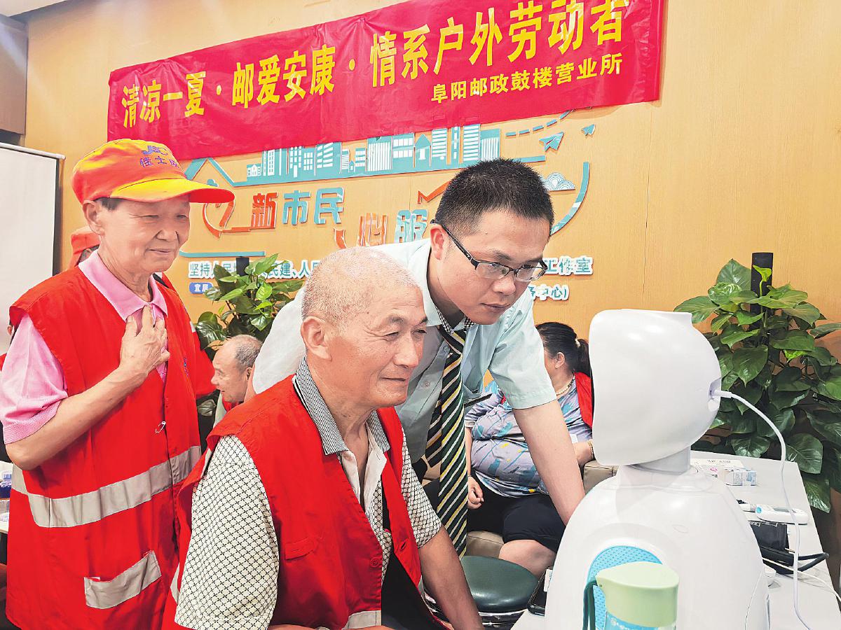 据了解,进入夏季以来,阜阳市邮政分公司37处“邮爱驿站”全部开启“清凉模式”,为环卫工、快递员、外卖配送员、出租车驾驶员等户外劳动者提供歇脚、喝水、纳凉等一揽子贴心服务。图为邮政工作人员帮助环卫工人利用智能视频医生系统在线连接知名医院的专家进行问诊。