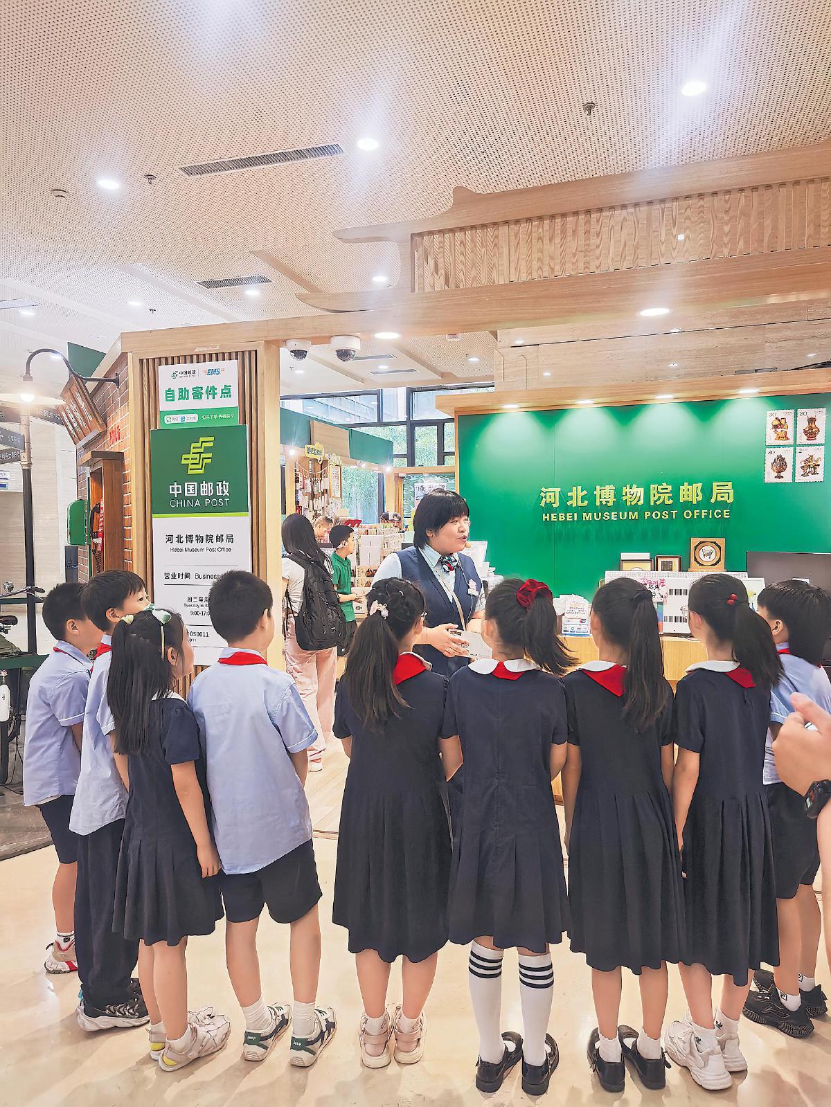 研学活动区,孩子们正认真聆听“博物院里为什么有邮局”研学课程,了解文物与邮票的知识,参与盖戳、填写明信片并寄出的活动。今年以来,河北博物院主题邮局已举办10余场研学活动,参与人数突破5000人次。