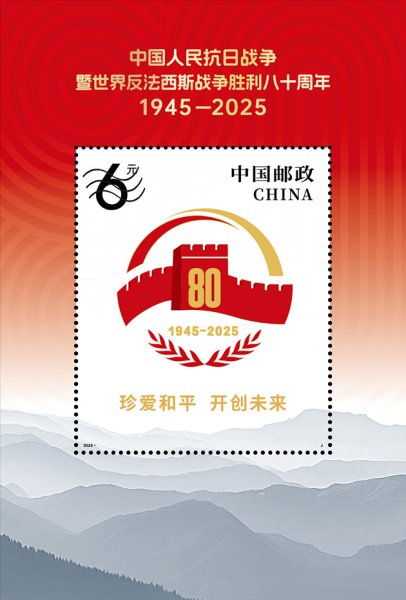 小型张使用中国人民抗日战争暨世界反法西斯战争胜利80周年纪念活动标识作为主景,主要表现“珍爱和平、开创未来”。