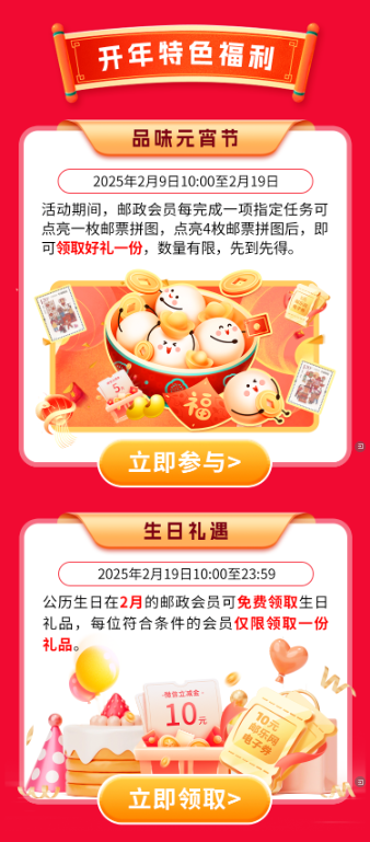 超多立减金、无门槛券、实物奖品齐发!2月邮政会员日福利放送开门红!