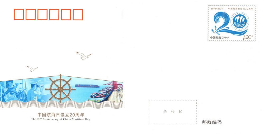 中国邮政定于2025年7月11日发行《中国航海日设立20周年》纪念邮资信封1套1枚。详情如下: