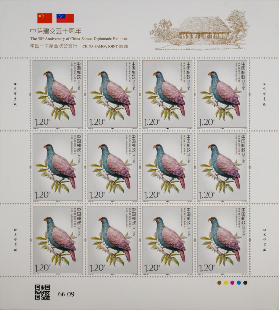 本套邮票以两国的特色鸟类为核心设计元素,融西方钢笔线条与东方淡彩的表现技法,笔触细腻传神,形象生动逼真,两只禽鸟顾盼相应、神气贯连,洋溢着蓬勃的生命力。本套邮票既展现两国独特的自然生态之美,更传递出两国友谊的深厚底蕴与美好未来。第一枚邮票表现了“白马鸡”。作为四川丹巴莫斯卡鸟类重要栖息地的主要保护物种,白马鸡也成为丹巴自然生态的鲜活代表,当地独特的高原气候、适宜的生态环境为其提供了理想生存空间。第二枚邮票表现了“齿嘴鸠”。作为萨摩亚的本土特有鸟类,齿嘴鸠不仅是当地生态系统的重要成员,更被视为萨摩亚自然与文化遗产的象征,承载着萨摩亚人民对家乡土地的热爱与珍视。